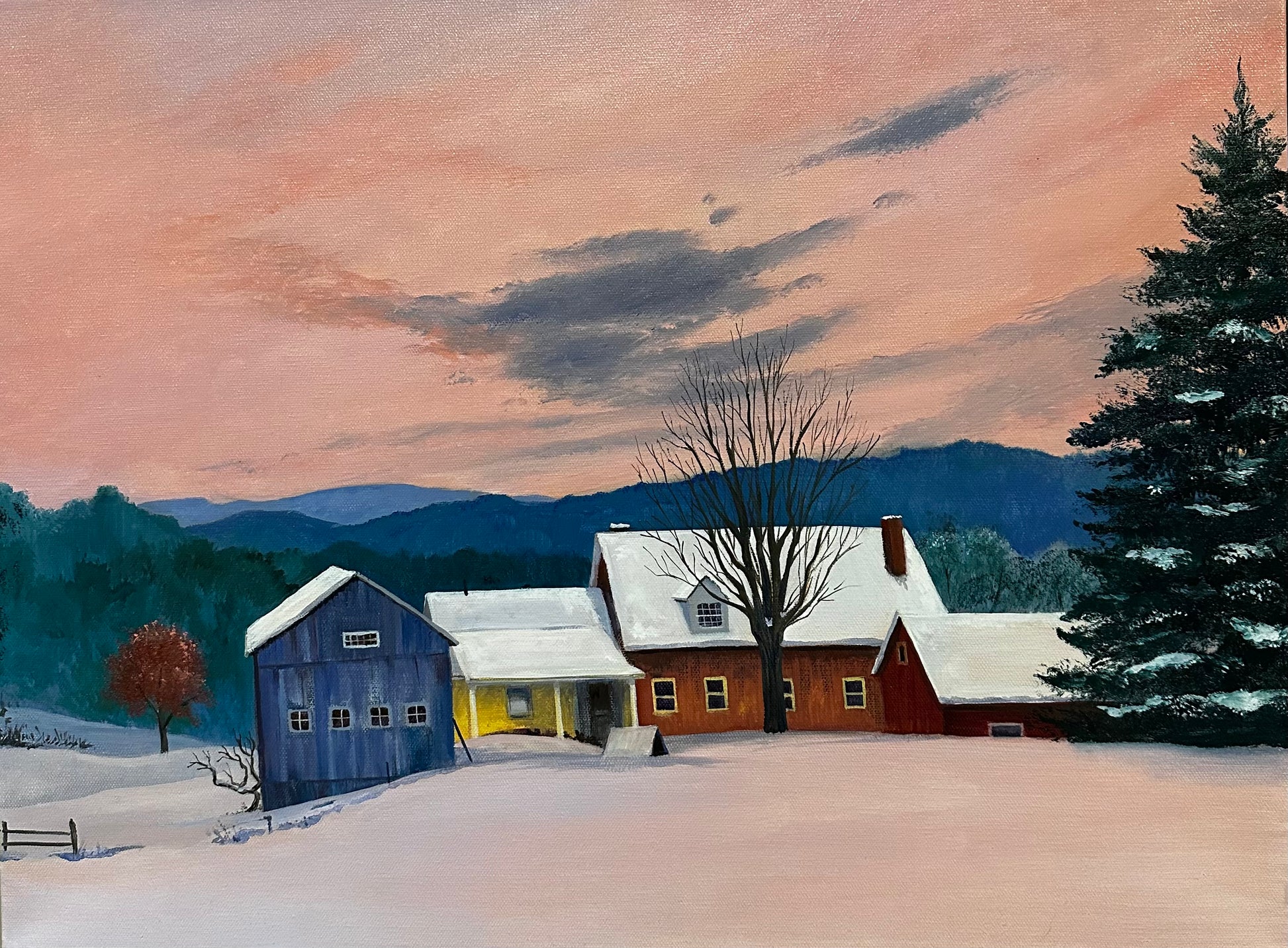 Pink light fills the cold mountain sky and reflects on the snow. Chimney smoke scents the air and this farm house sits on a ridge with beautiful mountain views.